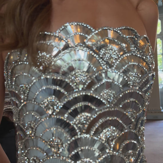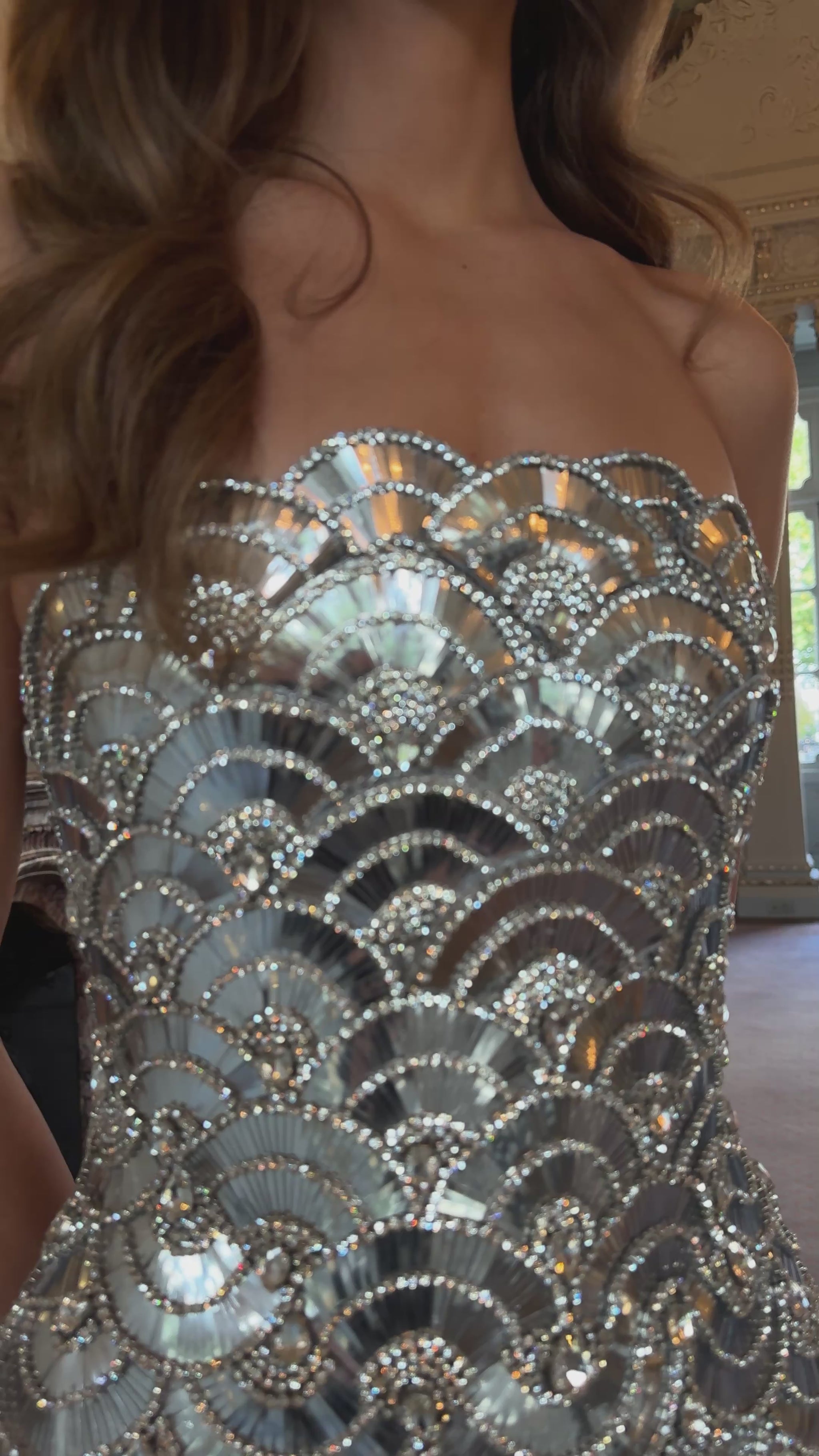Each Adara is crafted by skilled artisans, requiring over 130 hours of handwork. The fan-shaped scallop design is built piece by piece, with every curve carefully constructed and adorned with rhinestones to create a fluid, mosaic-like surface of brilliance. The strapless silhouette highlights the form, while the reflective, scalloped layers catch the light with every movement, imitating waves of liquid silver.