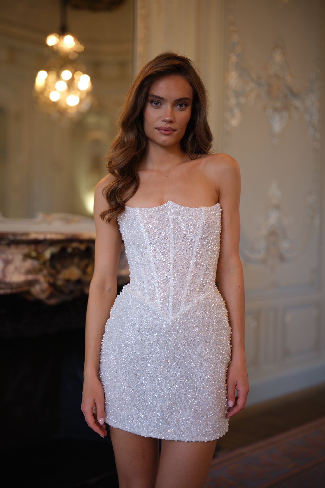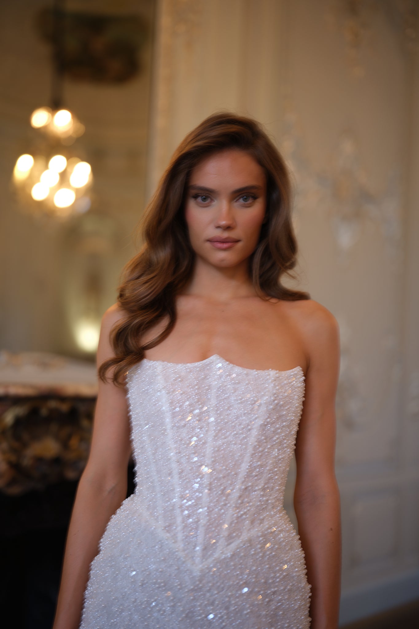 Encrusted from bodice to hem in shimmering pearls and light-catching beads, the Emma delivers high-impact sparkle without sacrificing sophistication. The strapless corset silhouette features structured boning for shape and support, while the soft, curved neckline flatters the décolletage with grace.