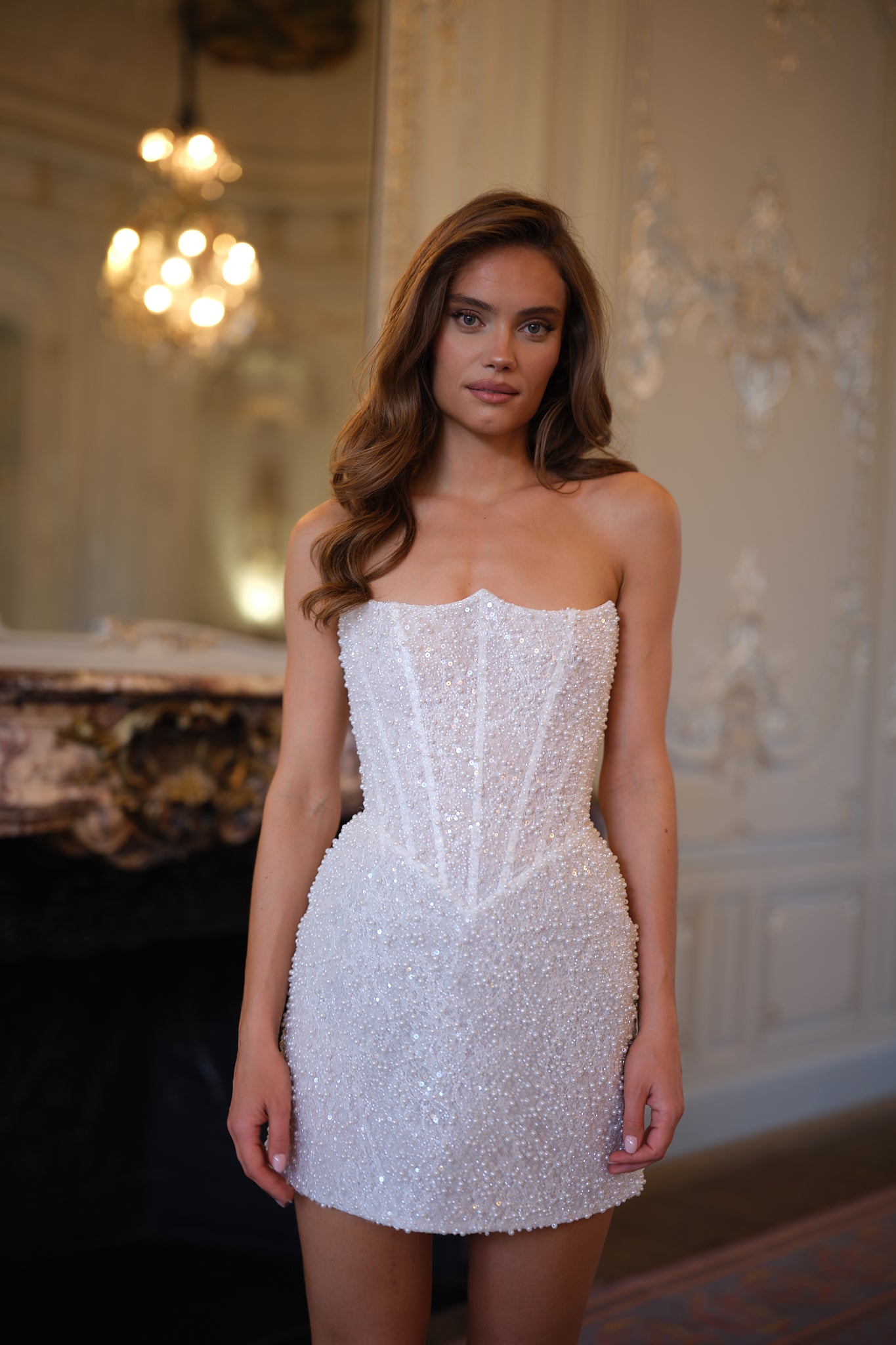 Its fitted mini length ensures modern appeal, while the dense, luxurious beadwork adds weight, texture, and unmistakable opulence. The Emma Mini is made for brides who want to glow, dance, and command the spotlight—unapologetically.