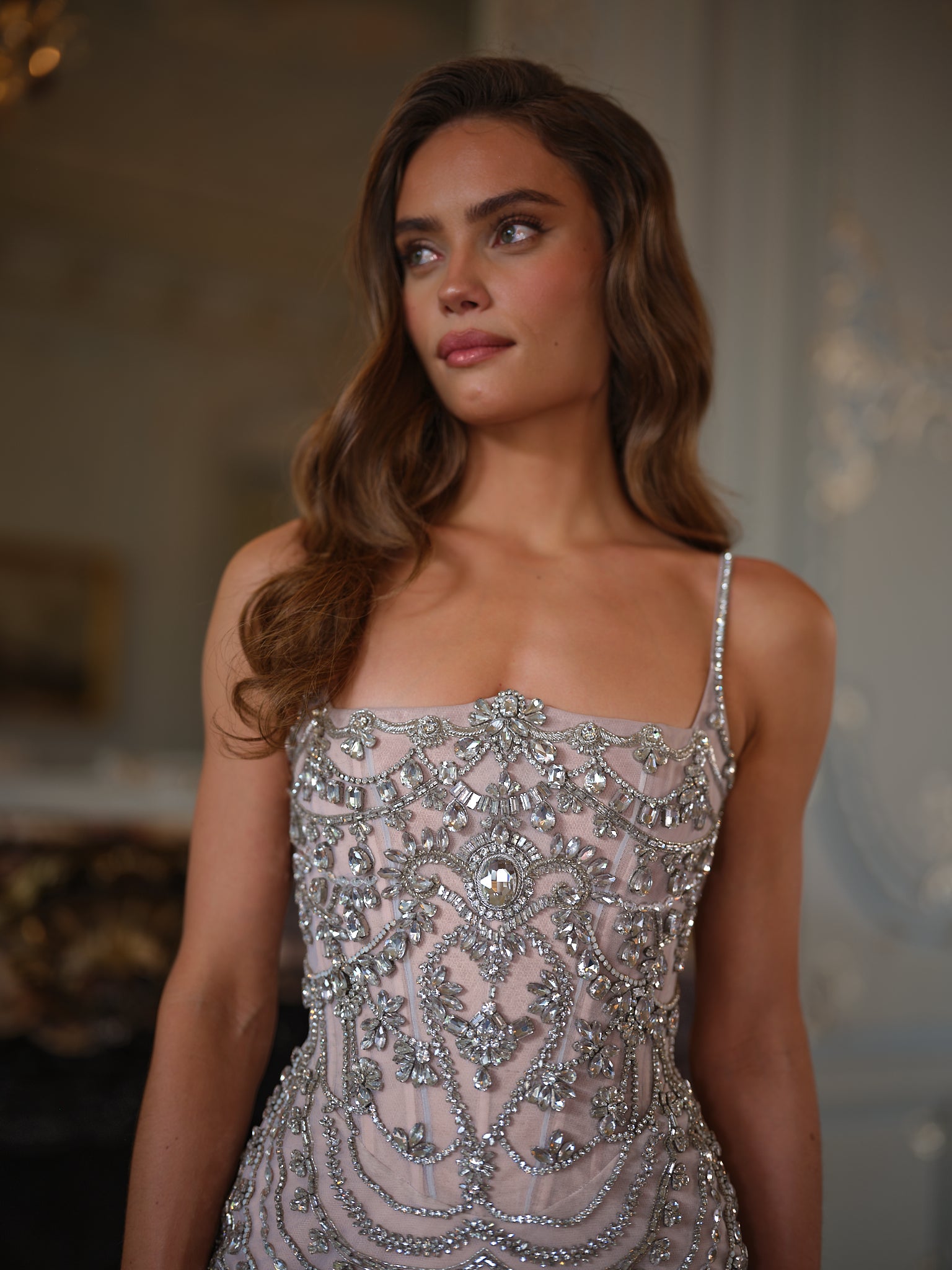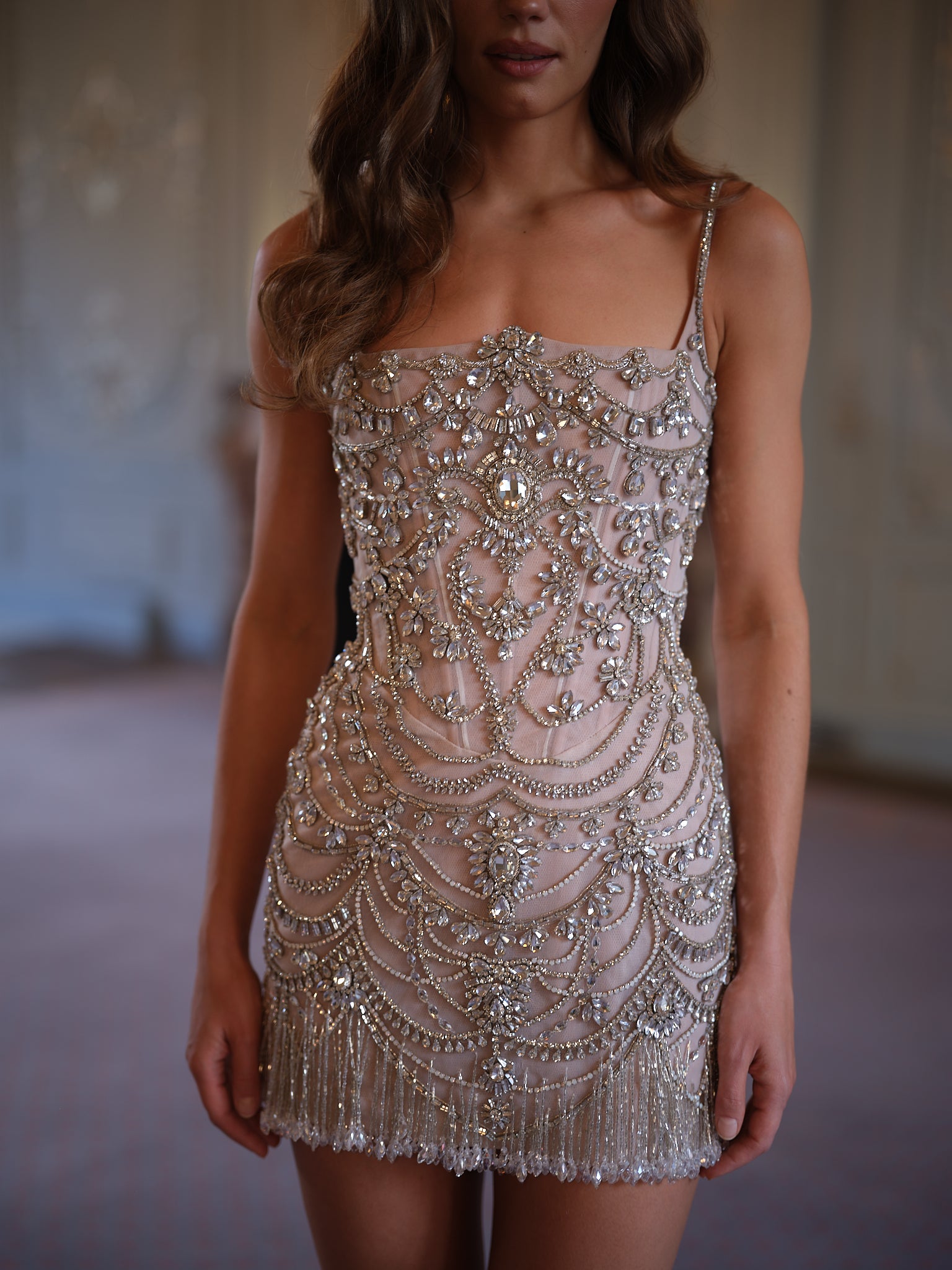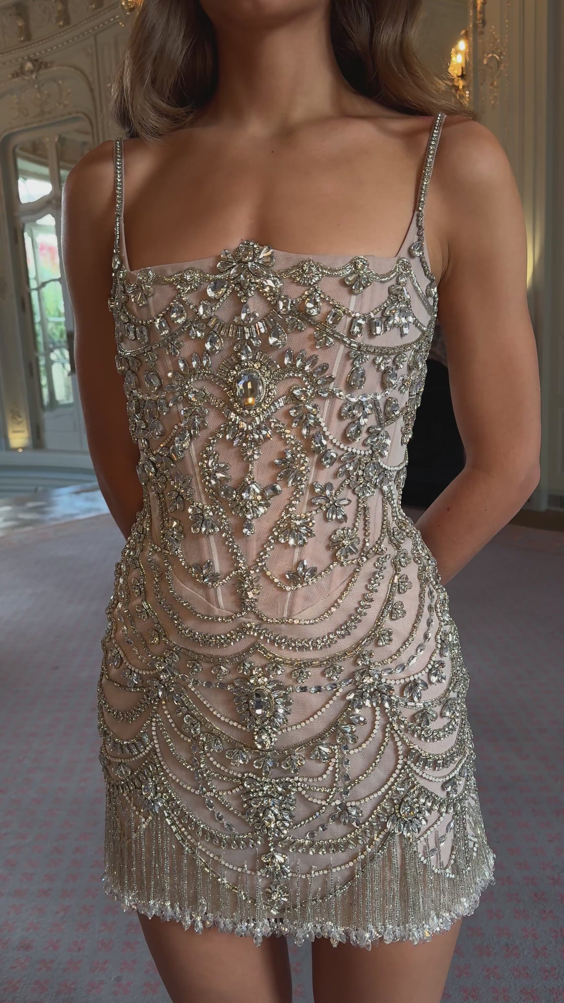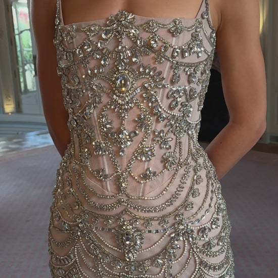 Every Giana is meticulously crafted by skilled artisans, taking over 100 hours of dedicated handwork. More than 1,000 crystals are individually placed to create its ornate design, cascading across the bodice and skirt in symmetrical patterns of light. The result is an extraordinary surface of sparkle, framed with crystal fringe that dances with movement. The fitted mini silhouette and delicate straps allow the embellishment to take center stage, balancing couture opulence with sleek modernity.