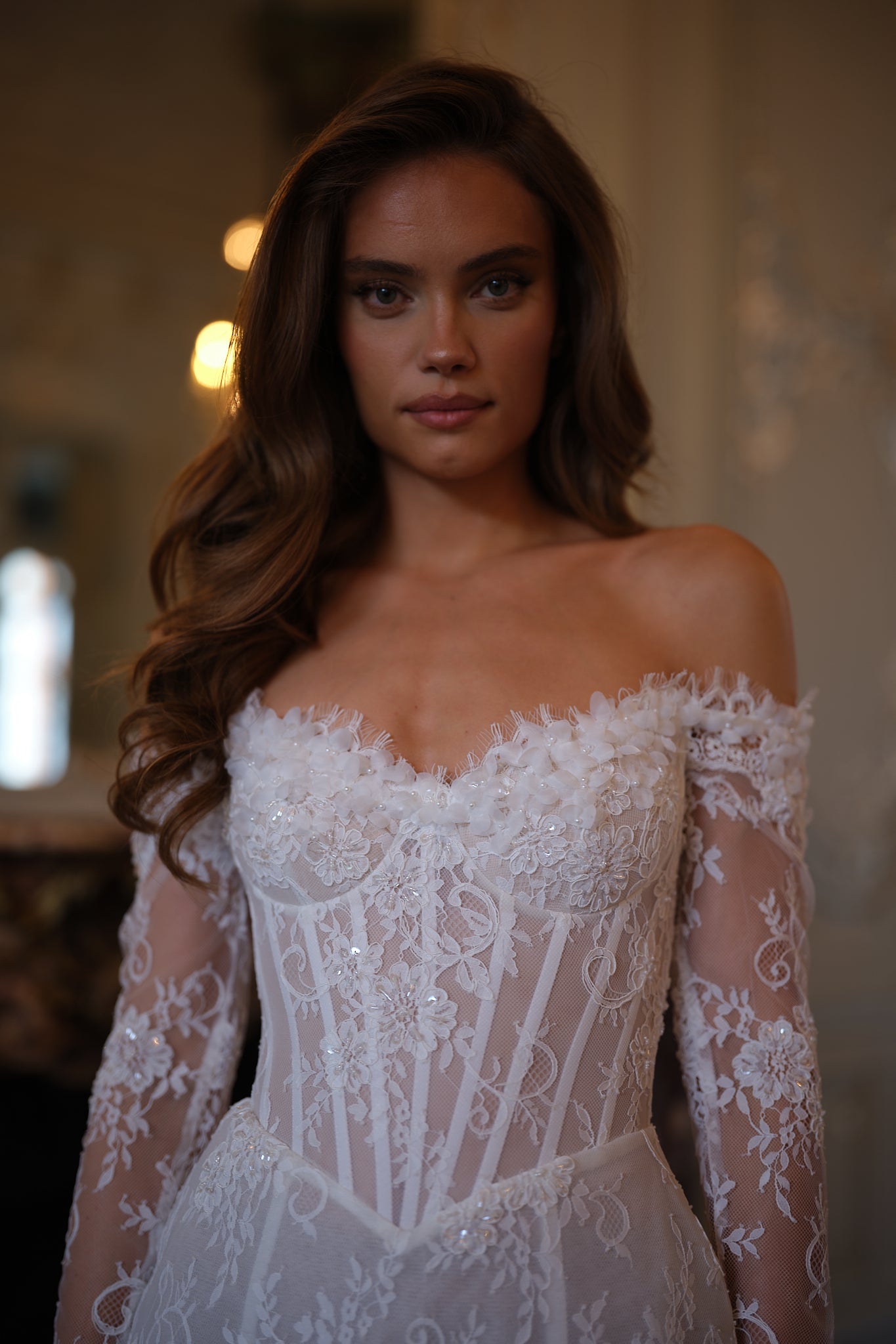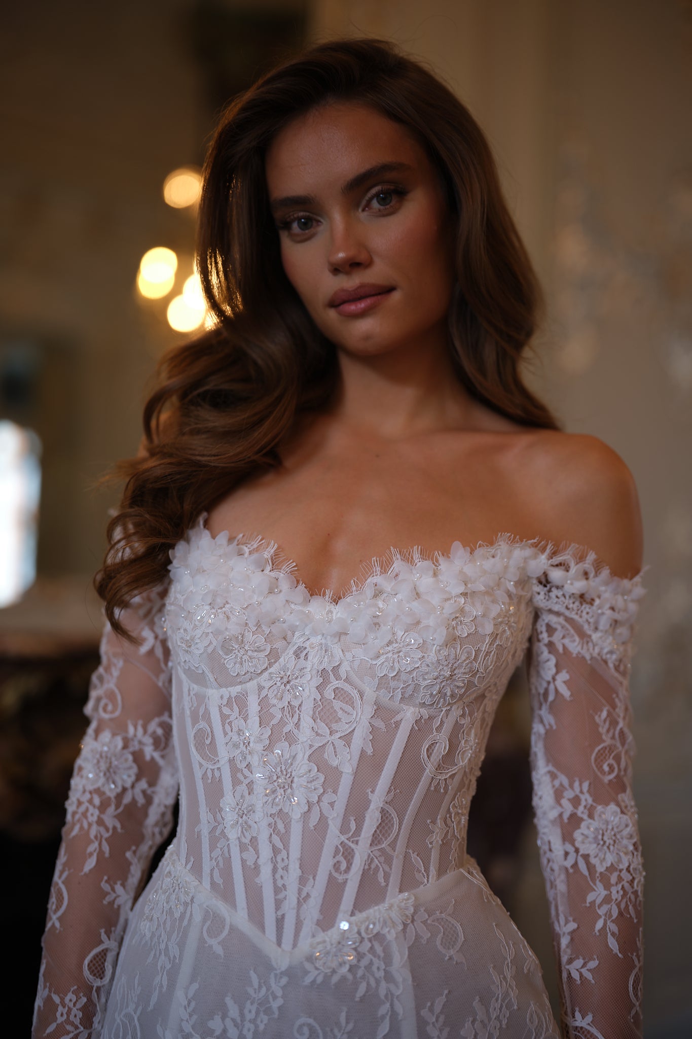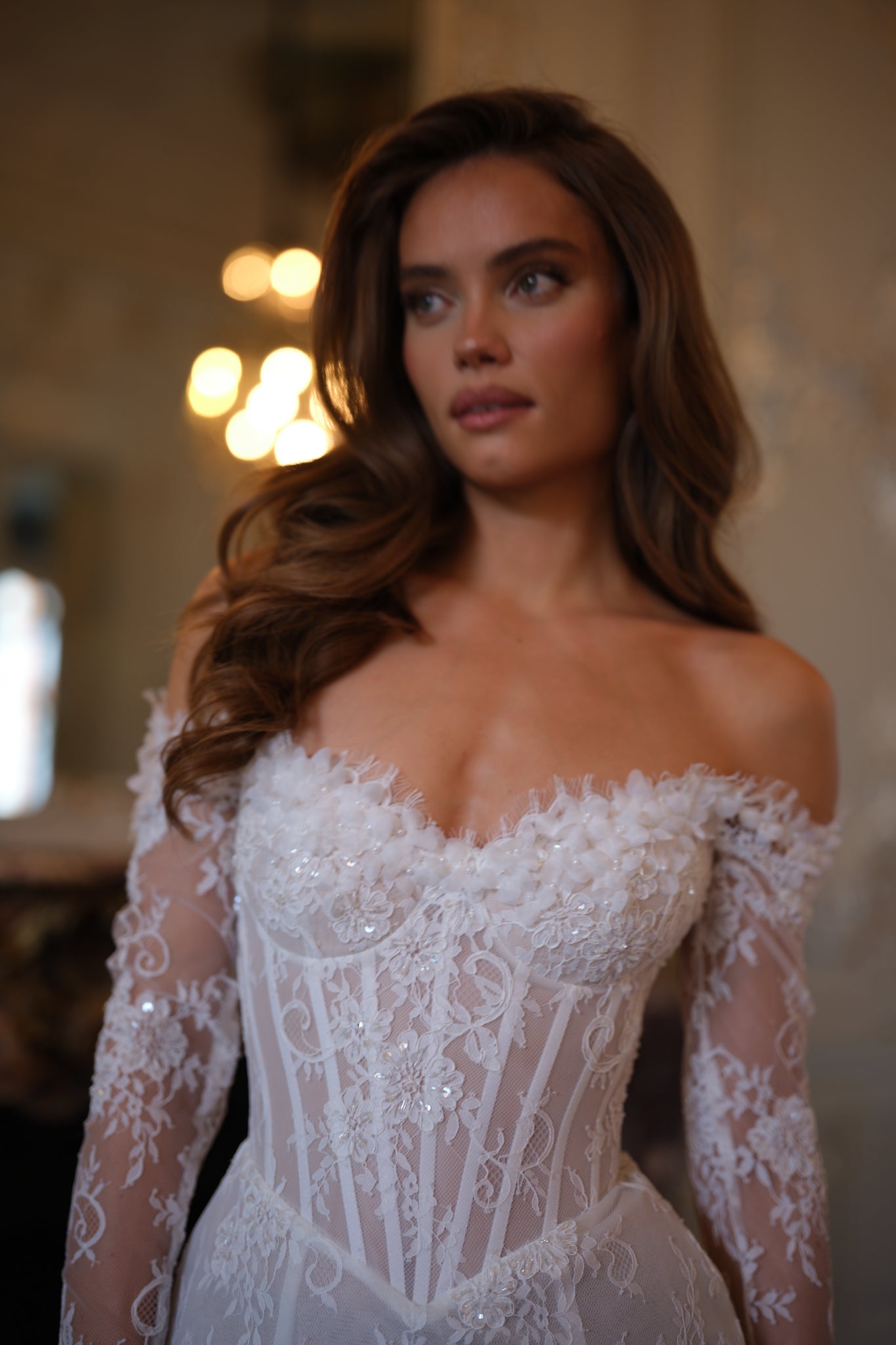 Crafted in intricately embroidered lace, the Lily features a corset-style bodice with visible boning that sculpts and supports, while delicate floral appliqué and subtle beading catch the light with every movement. The neckline dips into a soft sweetheart shape, framed by long sheer lace sleeves that gracefully fall off the shoulder for a romantic, ethereal effect.