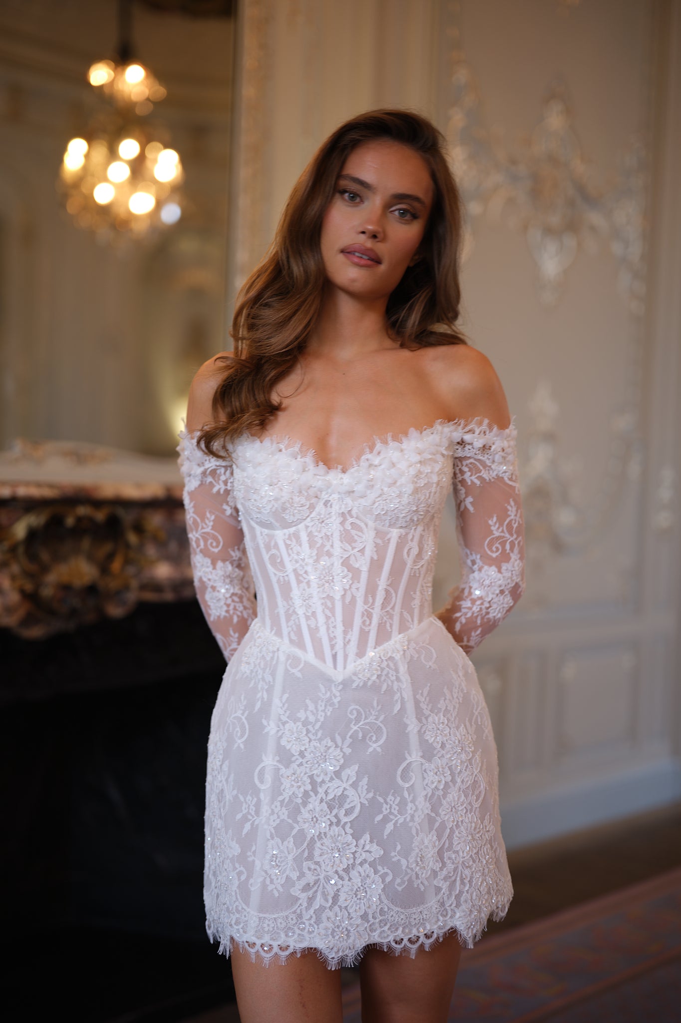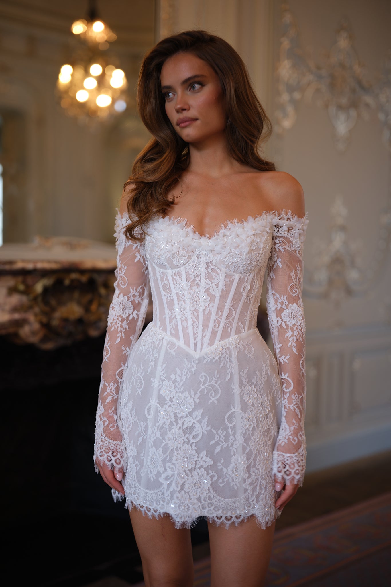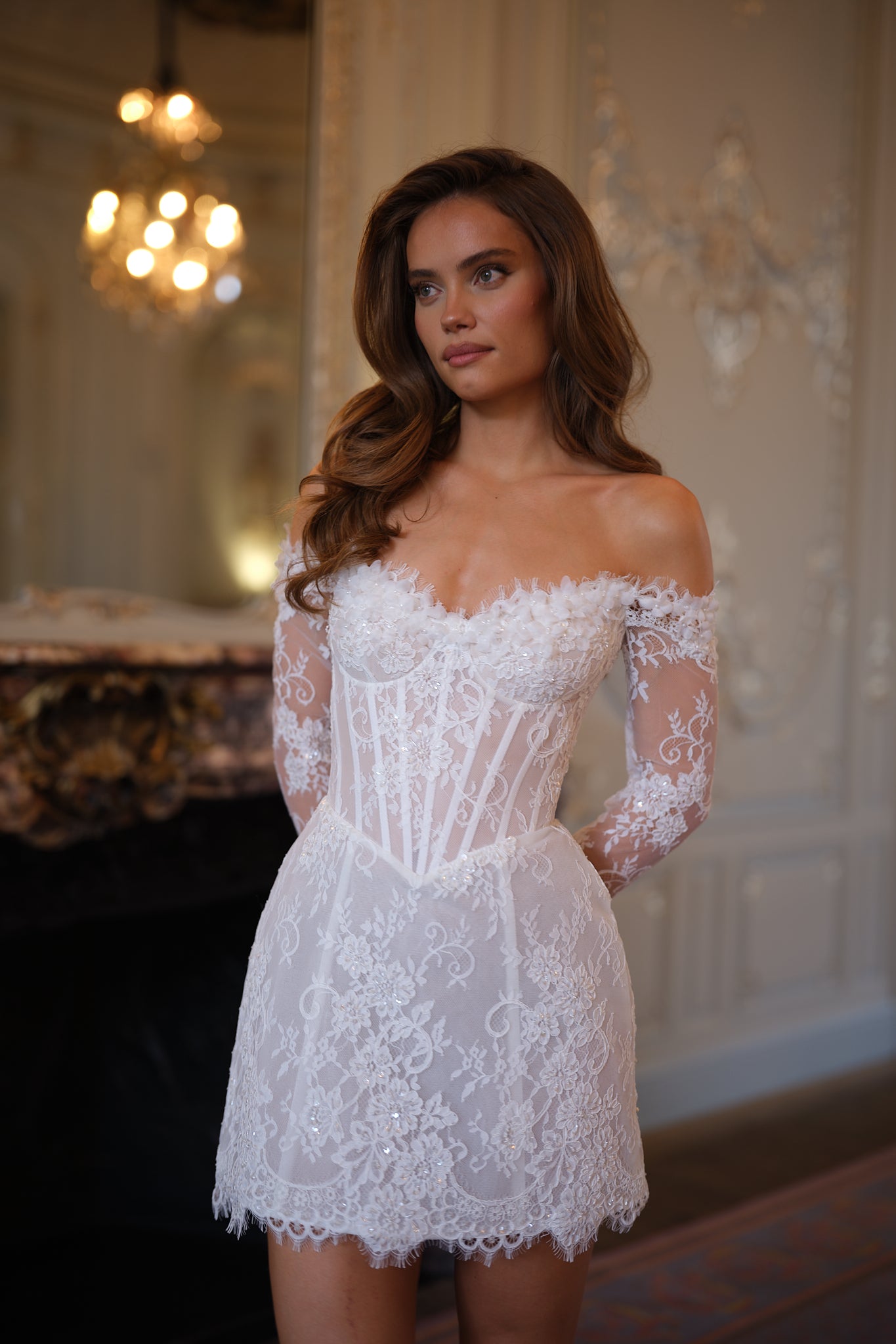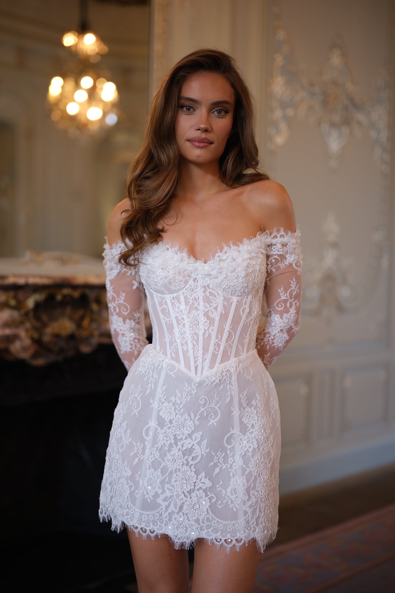 The fitted mini skirt showcases the ornate lace detail in full bloom, finished with a soft scalloped hemline for added texture and charm. Elegant yet bold, the Lily Mini captures the spirit of modern bridal beauty—light, luxurious, and unforgettable.