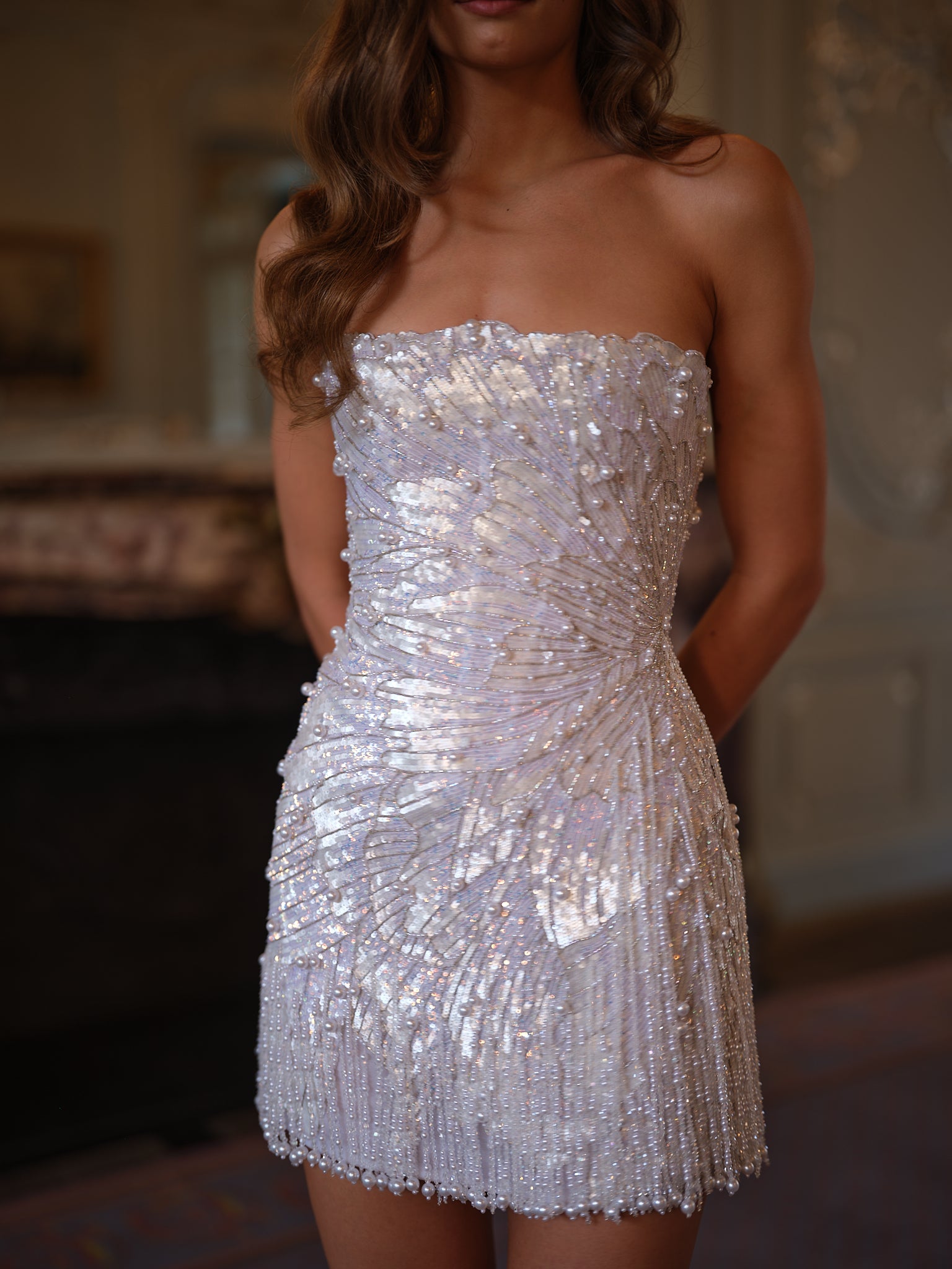 Detailing: Pearl-fringed hem and shimmering all-over embellishment