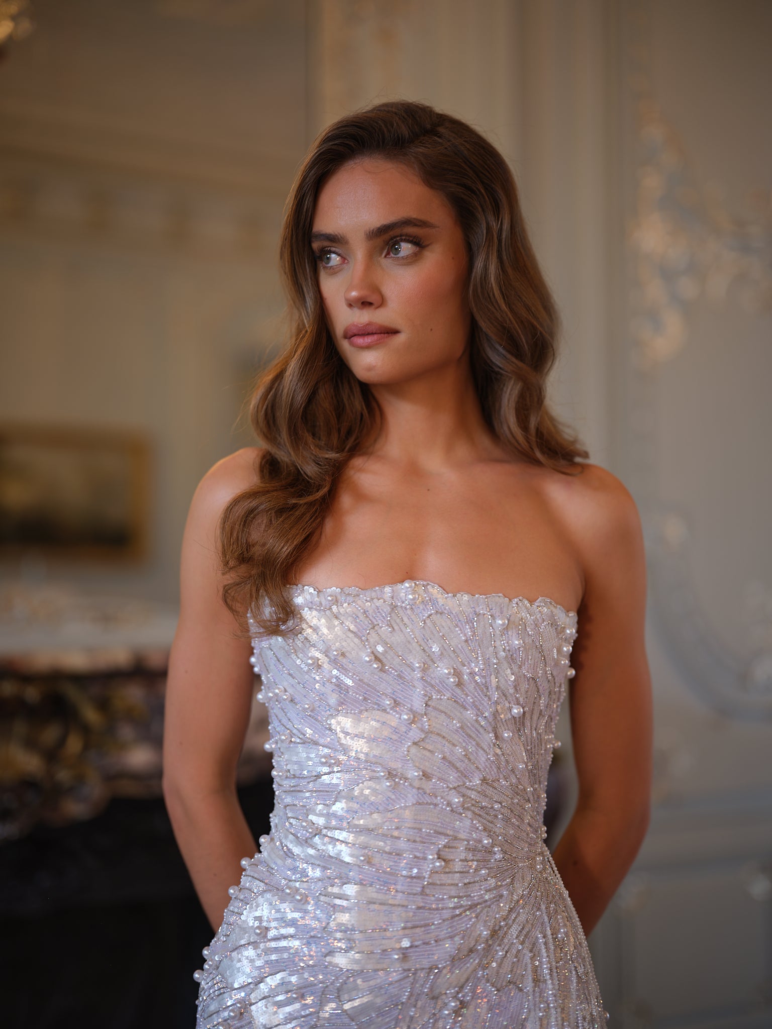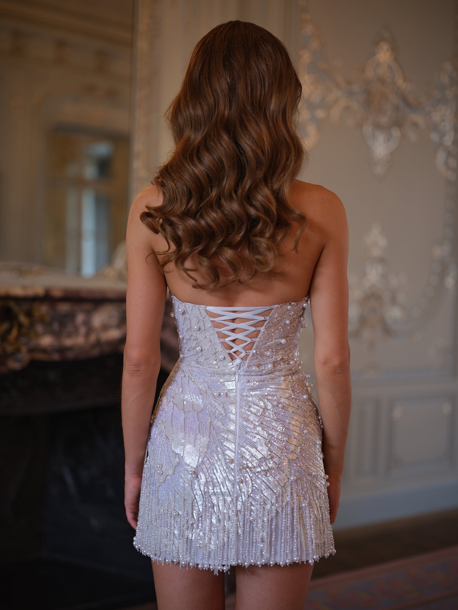 Taking over 140 hours of meticulous work, each bead and sequin is individually hand-placed by skilled artisans to create its radiant, wing-like motif. The strapless silhouette is sleek and sculptural, while cascading beadwork and sequins trace the body with iridescent dimension. Finished with pearl-tipped fringe at the hem, Seraphine glimmers like a living work of art, alive in motion and unforgettable in stillness.