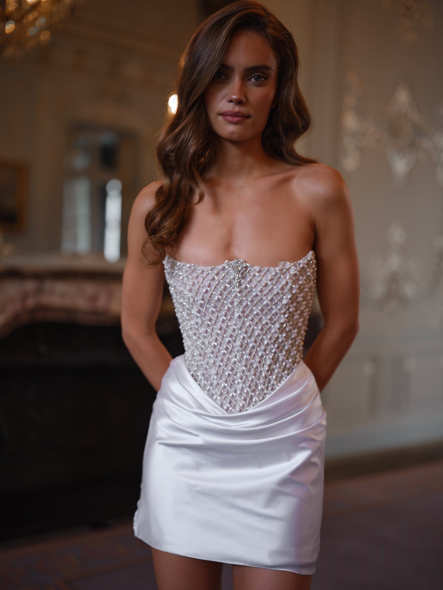 The bodice is meticulously hand-crafted, requiring over 30 hours of artisan work to create a luminous mesh of pearls and rhinestones that contour the figure like jewelry. This richly textured corset flows seamlessly into a sleek satin mini skirt, cut with soft draping that adds subtle fluidity to the sculpted silhouette. At the neckline, a delicate focal point completes the look with couture refinement.
