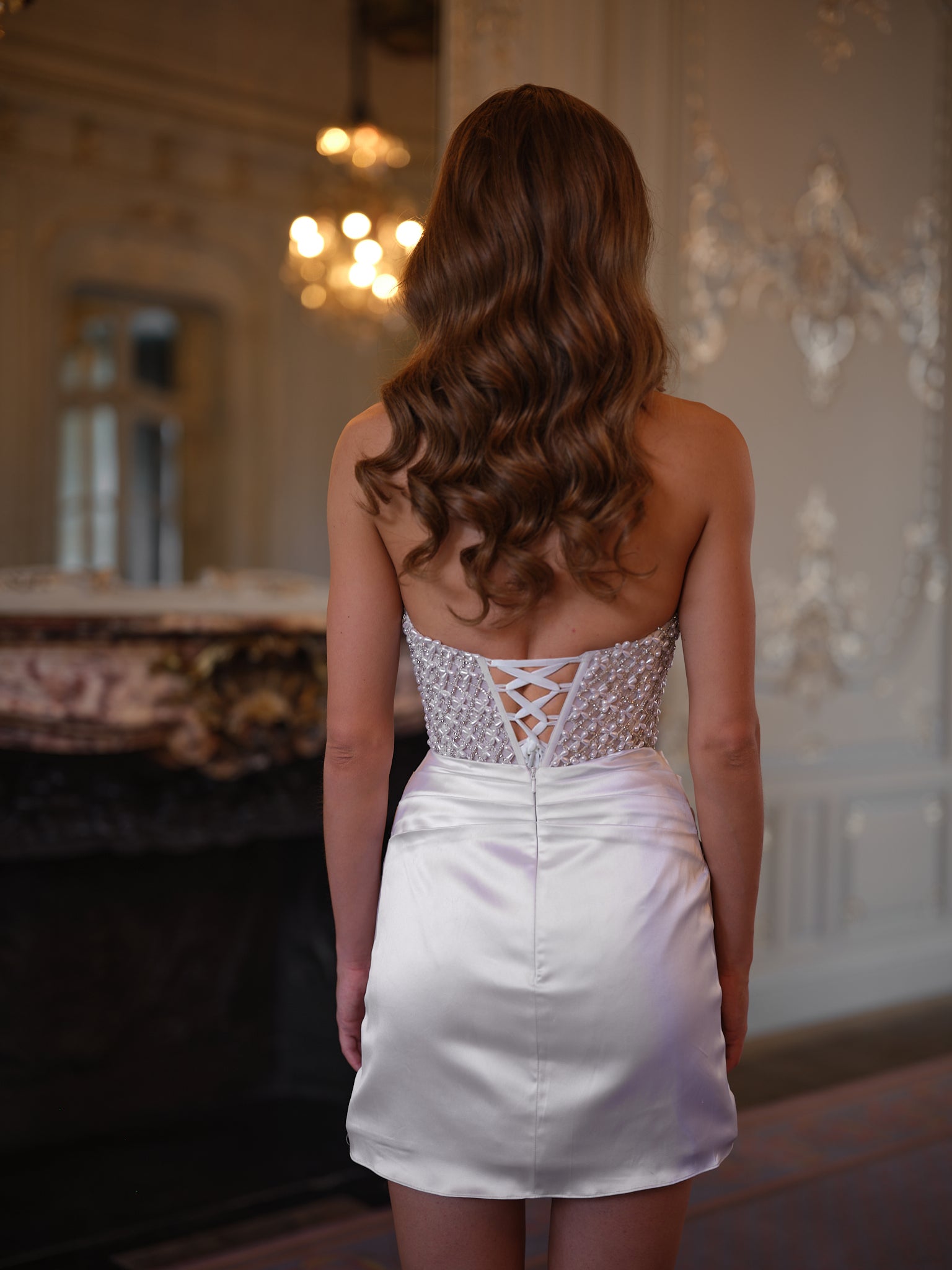 Design: Strapless structured bodice paired with a draped satin mini skirt